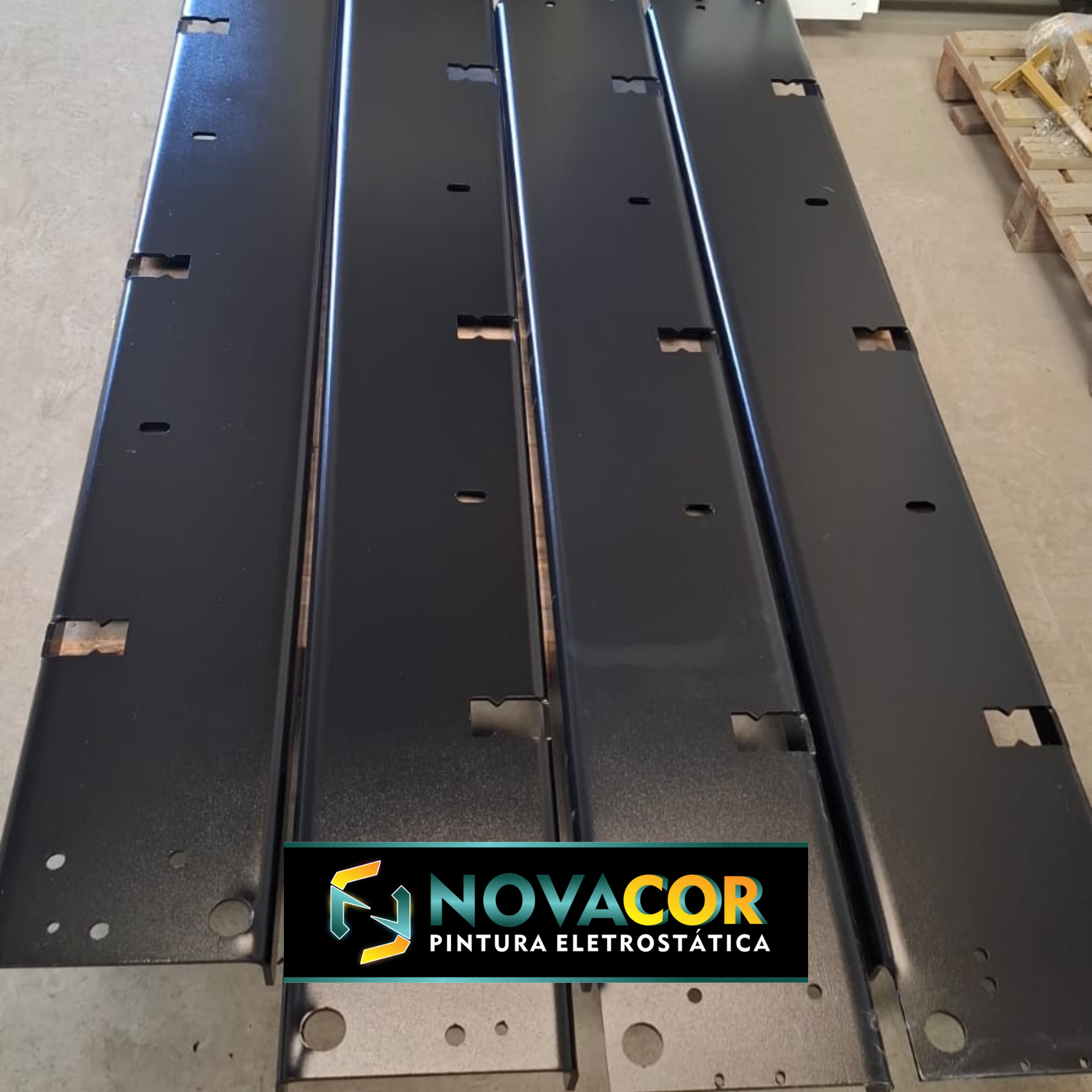 Serviço de pintura eletrostática em aço carbono com acabamento preto texturizado brilhante.